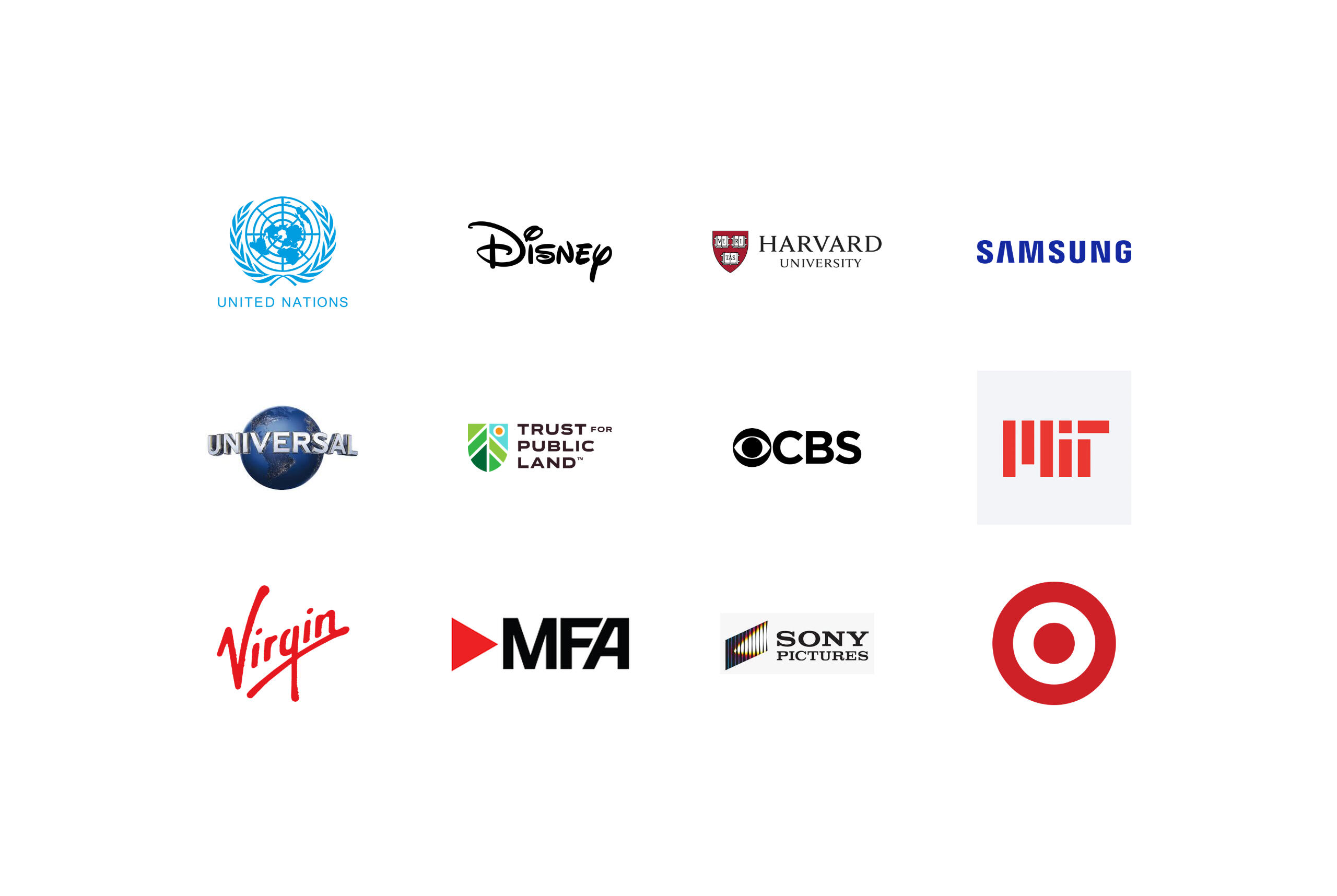 The United Nations, Walt Disney Studios, Harvard University, Samsung, Universal Pictures, Trust for Public Land, CBS, MIT, Virgin, Museum of Fine Arts Boston, Sony Pictures Television, Target.